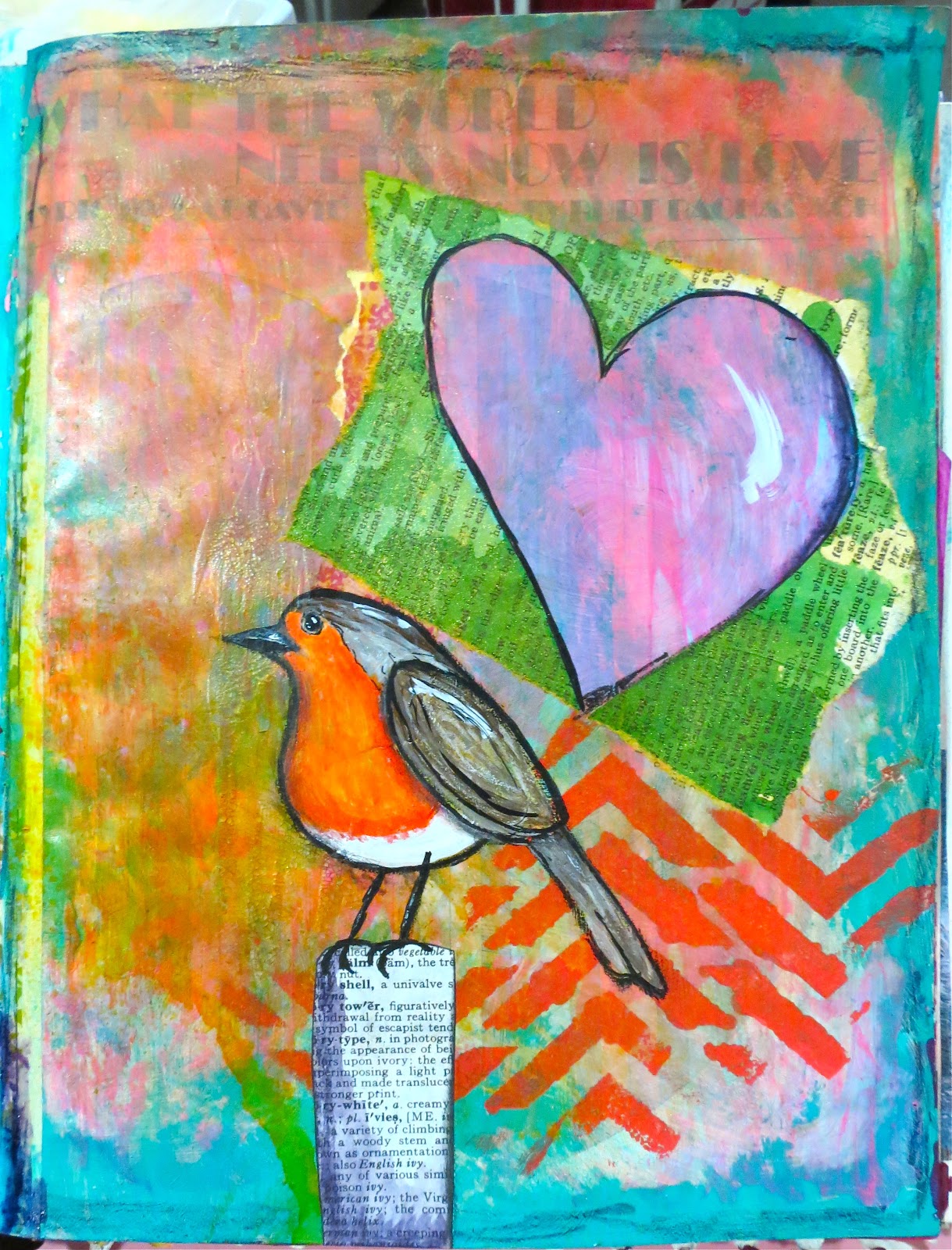 The original base page is the sheet music for "What the World Needs Now is Love." I added some hot pink craft paint, and added Tim Holtz Rock Candy Crackle Paint in a few places over the top of that. Then scrapbook paper; red acrylic paint through a Julie Balzer stencil, and turquoise paint over the top of that. I wiped a bunch of the turquoise paint off so you could see some of the crackles. Then added a little brown ink with a sponge to emphasize the crackles some more...